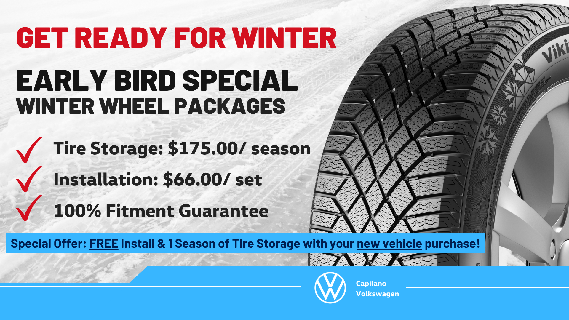 Inquire TodayDisclaimers: Prices shown exclude taxes, levies, shop supplies and environmental fees where applicable. Inventory is limited and availability may vary by model and trim. Images are for illustrative purposes only and may not reflect exact wheel/tire pictured. Tire storage priced per season; storage period and retrieval terms available from your Service Advisor. Free wheel balancing offer applies to qualifying Early Bird Winter Wheel Packages only. Free installation & one season of tire storage are available exclusively with the purchase of a new vehicle at Capilano Volkswagen. Specifications (sizes, part numbers, sensors) subject to change without notice. Please contact Capilano Volkswagen for details.